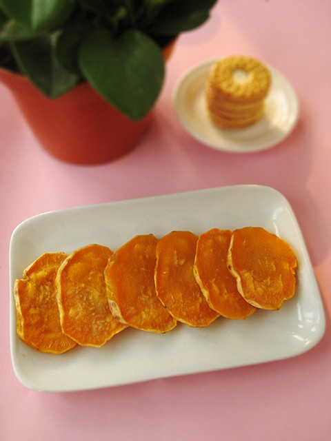 1、红薯洗净,去皮切成片,厚度以0.3cm左右即可。