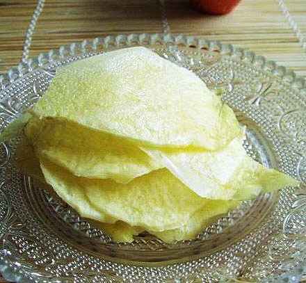 做法:土豆去皮切约1毫米薄片,碗里放少许水,加入盐和蘑菇精,把切好的土豆片浸泡5分钟,准备盘子,把土豆片依次贴放在盘周一圈。微波炉高火转4分钟,取出放凉后即可食用。