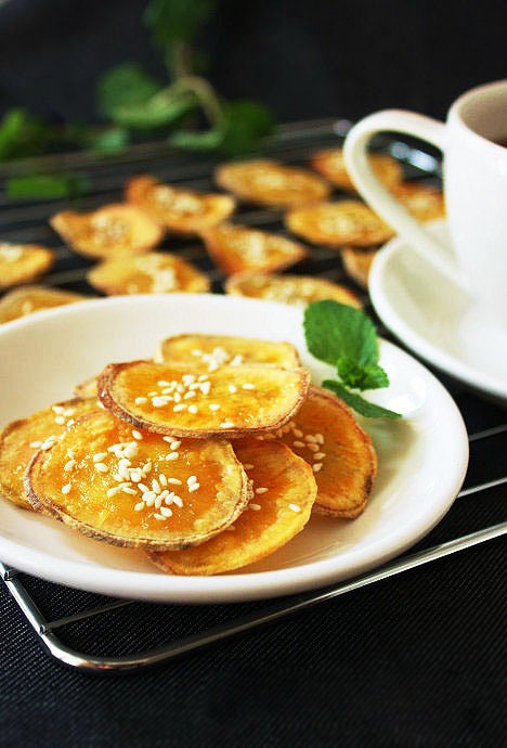 3.再次将烤盘取出,将地瓜片翻面,再次刷上糖浆后送入烤箱烤约5分钟后取出撒上芝麻即可。