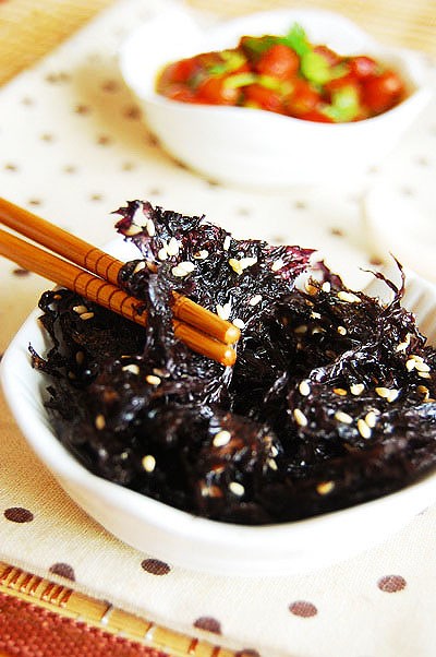 【准备材料】无沙紫菜20克、麻油15克、白芝麻1大勺、盐1/4小勺