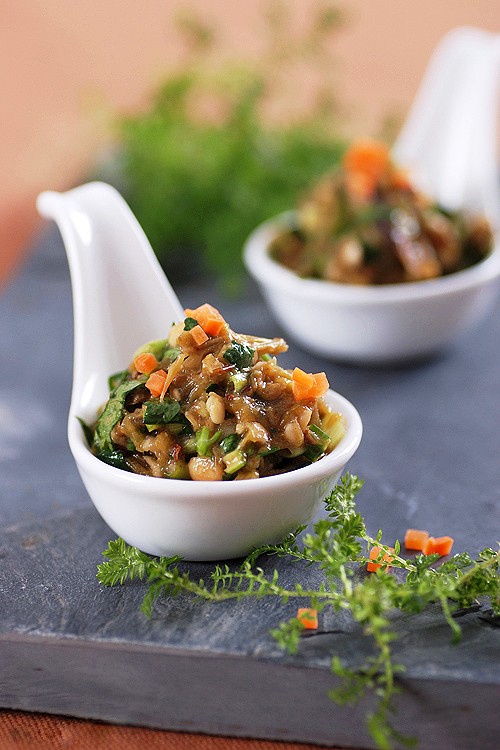 4.烤好的辣椒去蒂,同样用蒜臼子碾成泥,然后把所有材料都放入容器里,加盐,生抽,醋,香油拌匀即可。
