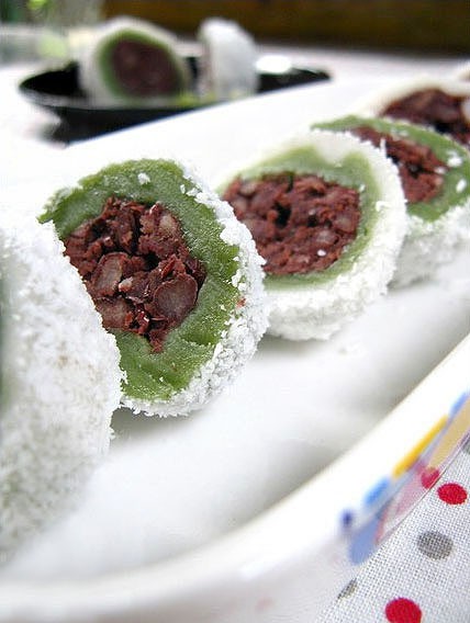 揉面团*用料:抹茶粉4茶匙越20g、红豆沙100g、椰丝一杯、糯米粉150g
