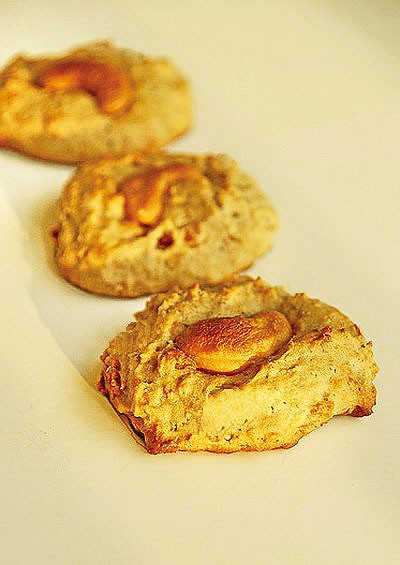 2、然后用手揪一小块,团成圆球,再按扁,在上面压上一颗腰果,放在抹油的烤盘上,180度烤20分钟。