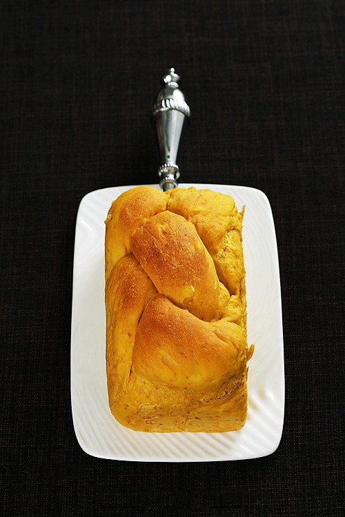 4)将三块面团搓成长条,然后编成辫子形,两头折入下面,放入烤模。