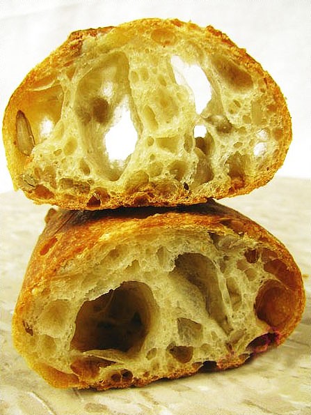 成品高大,割痕张开,但是没有耳朵,道理很简单-水分多的湿面团组织多洞,但是割包困难;而上课时我们的面团只有68%的水量(我这次的面团有75%的水量),割包很容易,但是组织就比较少洞。不过可以看到葵花籽哦。
