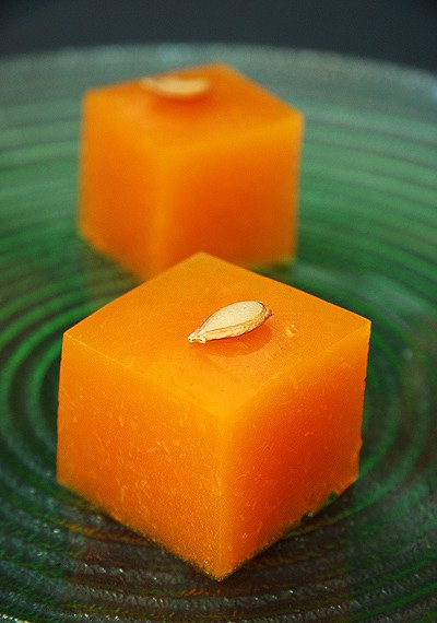 南瓜100g蒸熟和100g水打成泥+25g融化的琼脂=拌在一起冷藏后凝固切件即可。