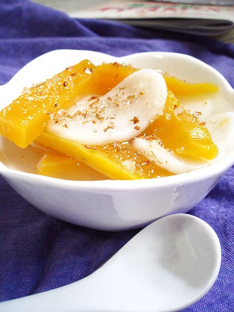 3、因为年糕很容易熟软的,到番薯快熟的时候,倒入年糕,煮开,转小火,再煮一会儿,让汤稠一点,出锅前撒上糖桂花。