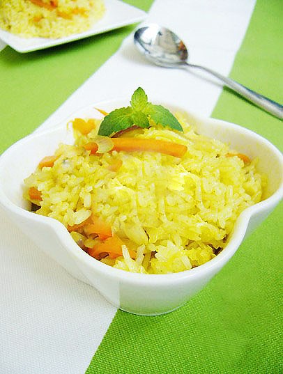 4,再倒入米饭,小火翻拌,均匀上色后,即可。