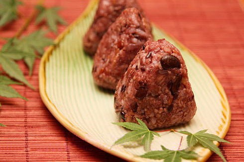 4、取杂粮饭约40克,摊平在手掌上,铺上馅料后,做成三角型饭团即可。