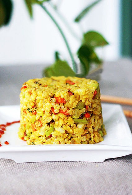 5、锅中入少许橄榄油或植物油,倒入蔬菜粒翻炒至8分熟后,倒入糙米麦仁饭,并调入适当盐和1大匙油咖喱翻炒均匀就可以了。