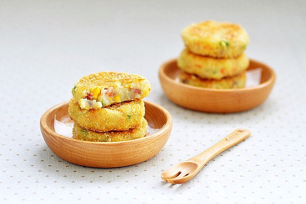 1.土豆 胡萝卜 豌豆 甜玉米粒(罐装) 2.面粉 糖浆 面包屑