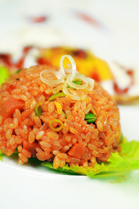 6):下入米饭翻炒,使每一粒米饭上都包裹番茄汁
