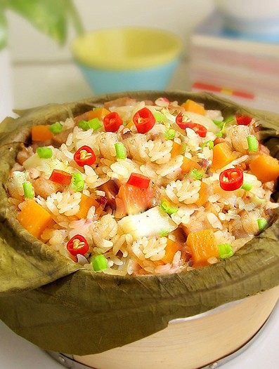6.取蒸笼,铺上荷叶,放上糯米饭,放进蒸锅大火蒸约30分钟就可以了。做两人份可以用两个小蒸笼,一张荷叶可以剪成两半来用。