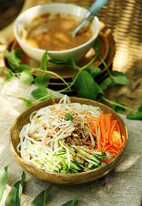4、将麻酱用等量的水调稀,加入香油、红酱油、醋、糖、味精、花椒油、红油、调成汁。在碗中放入适量凉面以及配菜,浇上适量麻酱汁即可。