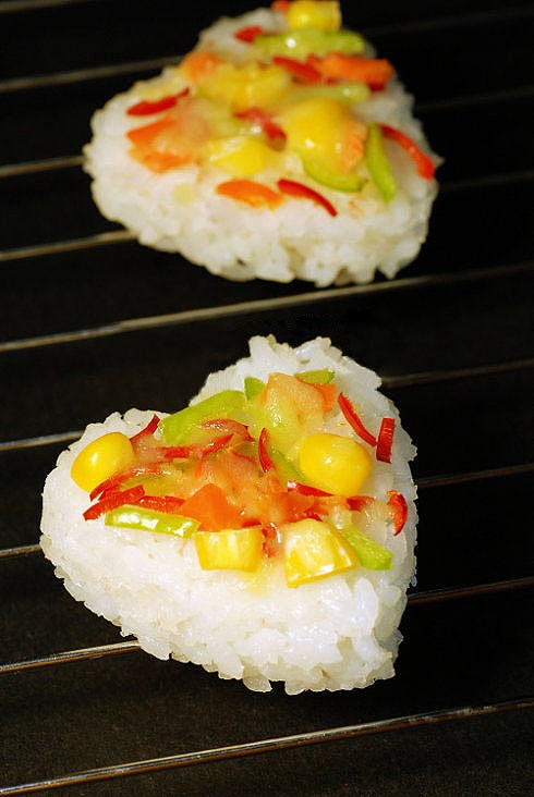 原料:米饭200g盐3g青椒20g,红椒20g,胡萝卜20g,玉米粒20g,素起司20g。