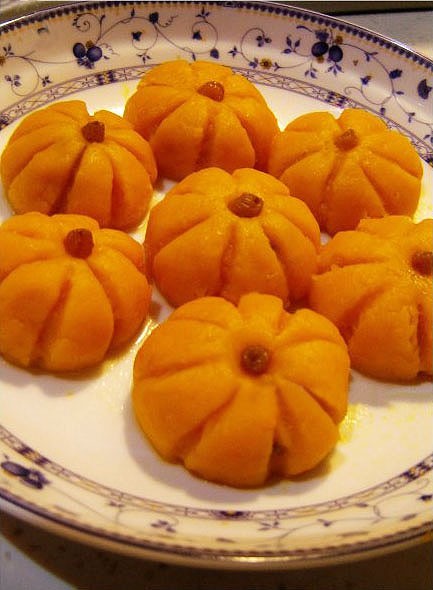 用料:8两重的小南瓜一个(如果买大南瓜就切一半好了)、糯米粉、葡萄干
