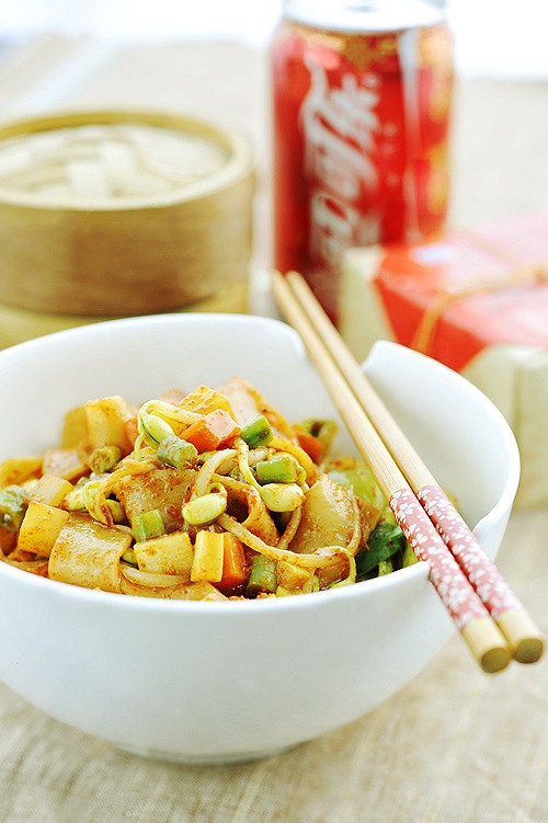 7)将焯烫过的油菜,土豆,胡萝卜,黄豆芽和豇豆铺在碗底。然后把扯面放在菜上面,撒上盐,倒入醋和生