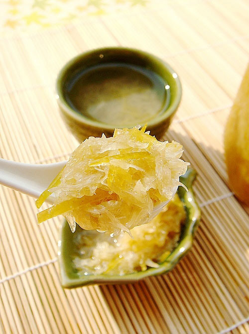 3. 完成上面的一步后,将柚子冲洗一遍,擦干水分。用小刀或刨刀将黄色的表皮部分削下,尽可能地削薄一点,尽可能地少带些白色膜的部分(白色部分是苦味的根源);将削下的皮切成细丝,尽量细一点。锅中烧开水,加2小勺盐,将果皮丝煮七八分钟后,捞起,冲水沥干,此步的目的也是为了去除苦味;煮果皮丝的时候,将柚子的果肉剥出来,去掉籽,筋,膜,只要果肉。果肉可以尽量弄碎一点,也可以用搅拌机打一下。