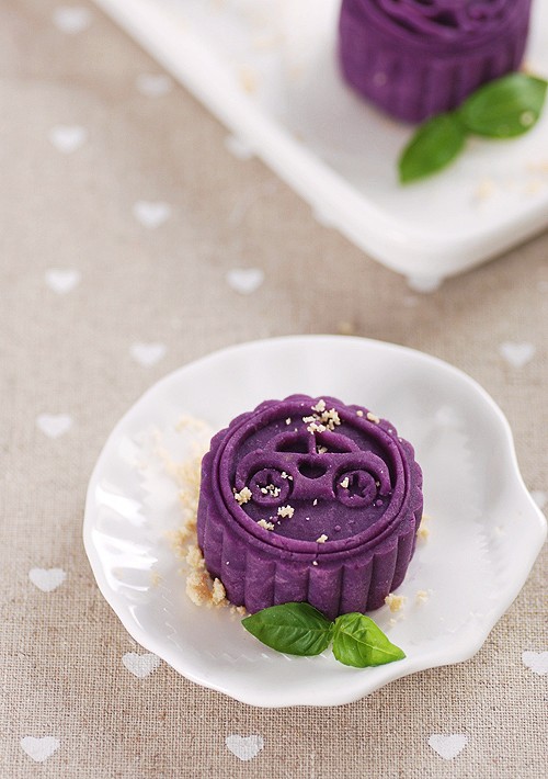 3.取大约50g左右的紫薯泥,团成球状,放入月饼模中,压成型。摆入盘中,撒上碎果仁即可。