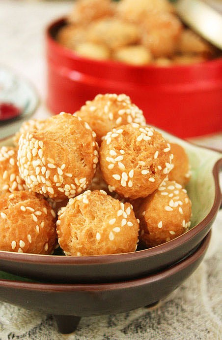 3.将小剂子揉成小圆球,将小圆球放入白芝麻中滚动,使之表面沾满白芝麻,这样,开口笑的生胚就做好啦;