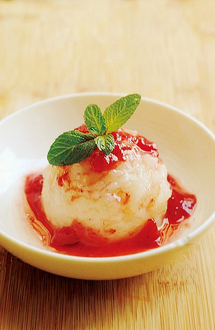 3.用叉子在上面轻轻的划出条纹,淋上草莓果酱加薄荷点缀即可。