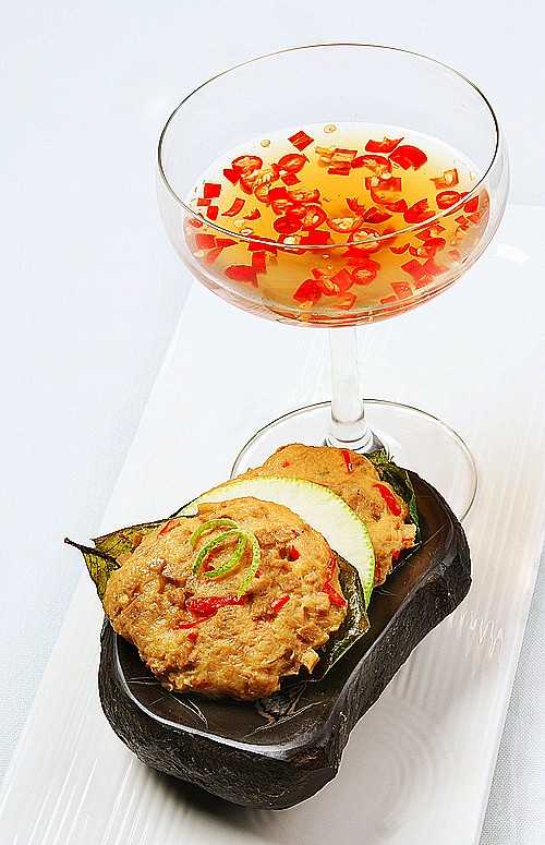 材料:柠檬叶、素鸡肉浆、素小牛排、小米椒、柠檬、素鱼露、泰式白醋(Distilled Vinegar)