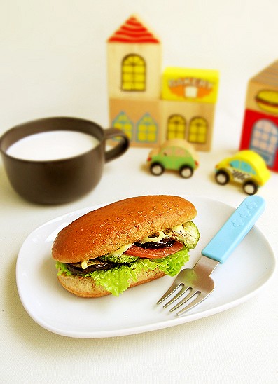 材料:全麦面包......3个、茄子......1/3个、番茄......半个、西葫芦......1/3个、生菜叶......适量