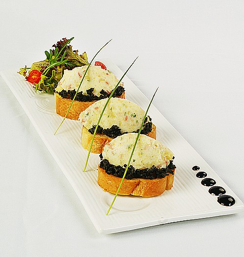 10.将步骤(9)土豆泥,放在烤香的切片面包之上,周围用步骤(7)黑橄榄粒围边装盘,用芝麻叶、罗沙红生菜、叶生菜、圣女果片装饰即可。
