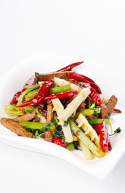 6.另起锅,锅中倒入适量精制油,放入姜丝煸香,放入花椒继续煸炒,然后放入步骤(5)竹笋条、素牛排条、莴笋条炒匀。放步骤(5)干辣椒,淋少许美极酱油、糖少许、蘑菇精、盐炒匀,继续煸炒(火要大动作要快)。最后放入香菜段,淋少许花椒油炒匀,出锅装盘即可。