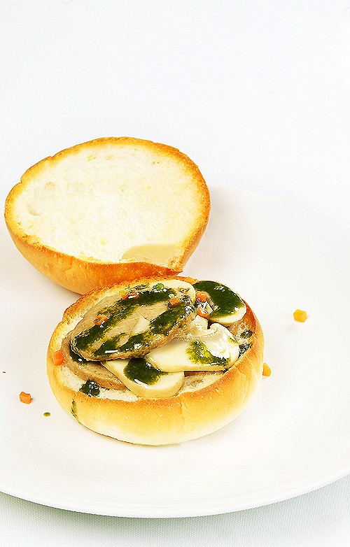 8.取步骤(5)面包,放入步骤(7)馅料,面上淋罗勒青酱即可食用。