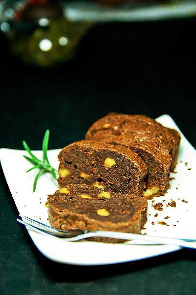 材料:黑巧克力70g,植物黄油85g,糖70g,高粉35g,核桃碎35g,盐0.5g