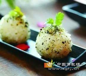 3、在饭团上撒上些话梅粉(话梅粉以台湾生产的为佳,可以在网上购买到)。