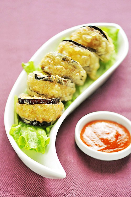5)锅中倒入油,大火烧热至油8成热时,将茄盒裹上面糊后放入油炸约1分半钟左右,待双面金黄色后捞出。