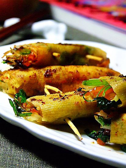 3、每张小豆腐皮中间铺上红椒条和香菜段,卷紧,用牙签固定;