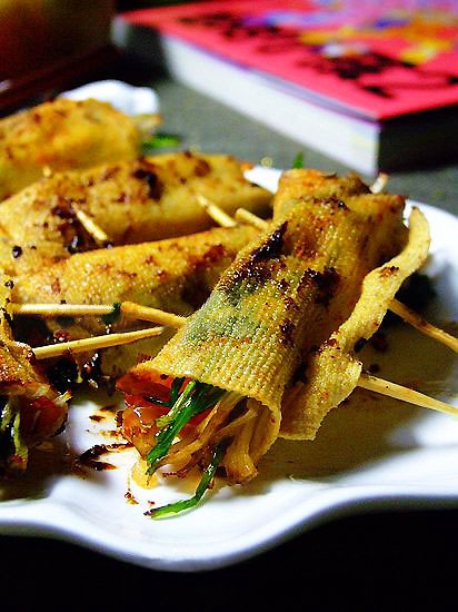 4、锅内坐宽油,油烧热后,下入豆皮葱卷炸至外皮微黄,捞出控油;