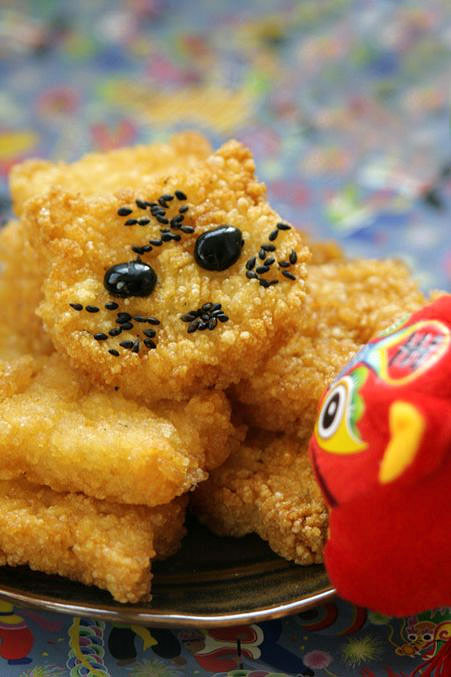 7.用模具在米饭饼上扣出自己喜欢的形状,为了避免发生粘连现象,可以在每次操作之前先把模具淋上少许清水。(没有模具的话,可以直接用刀切.)