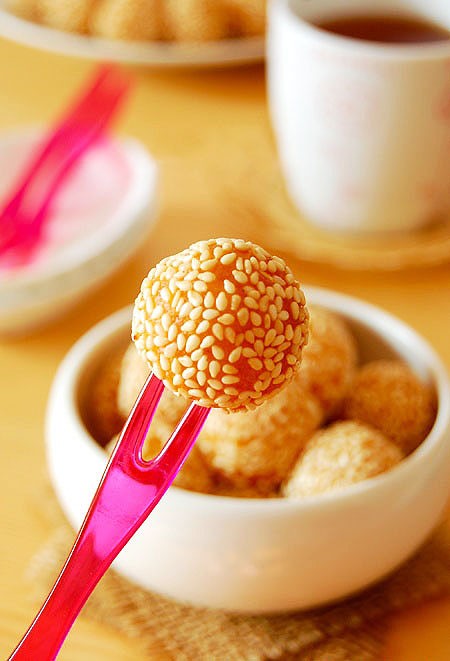 2、把揉好的山芋糯米面团分成每个约10克左右的小面团,分别搓成小圆球状并滚上一层白芝麻,依次都做好。