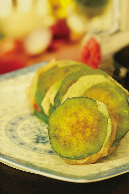 3.炒锅中放入500ml的油,烧至8成热的时候,将茄合粘面糊封口,放入锅中,转中火(以免茄子变成黑色)炸5分钟即可。