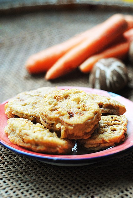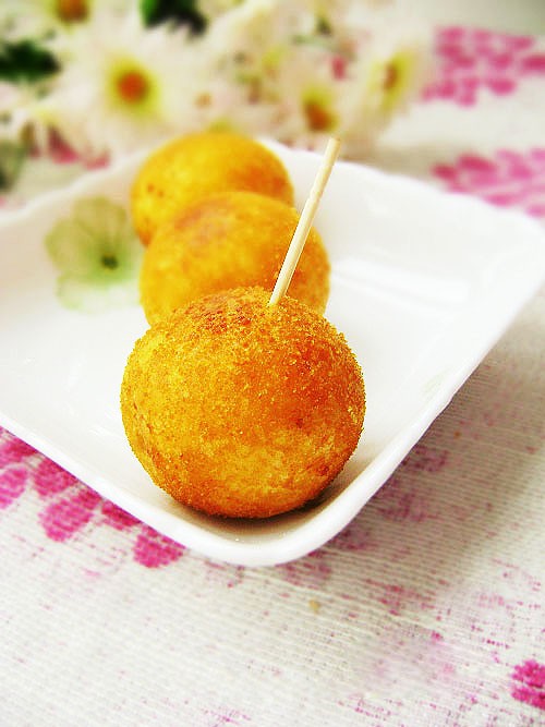 4.起锅,锅内倒入精制油,开火待油温升至5成左右放入沙嗲菇粒串炸,炸熟后取出沥干油,装盘OK啦!