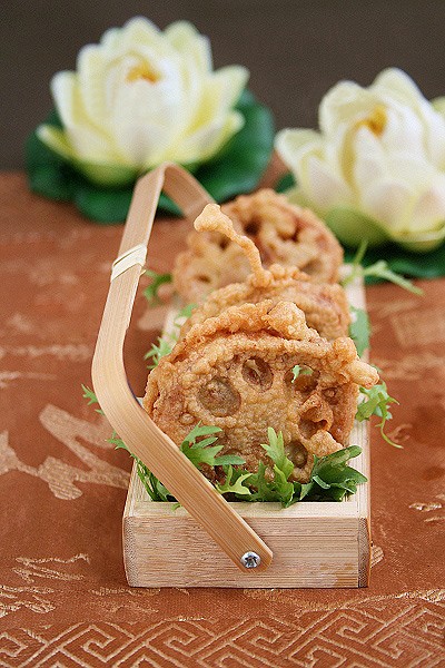 5、将夹好的藕盒粘上面糊,放入4成热的油锅中,用中火慢慢炸至外表金黄即可,最后可以搭配椒盐食用。