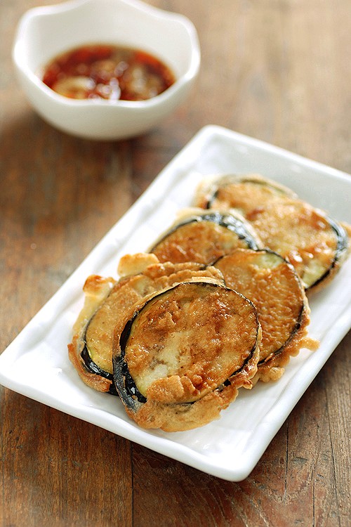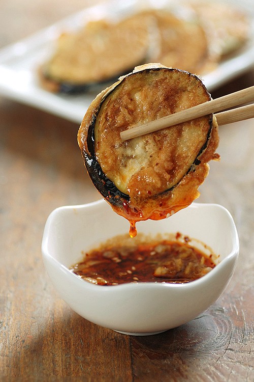 2.茄子蘸一层面糊,放入提前热油的煎锅里,小火煎至金黄后翻面,煎至两面都金黄即可出锅。