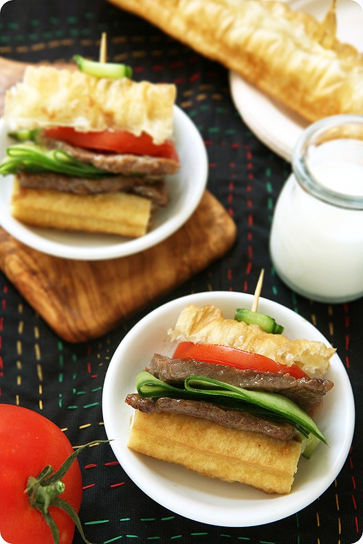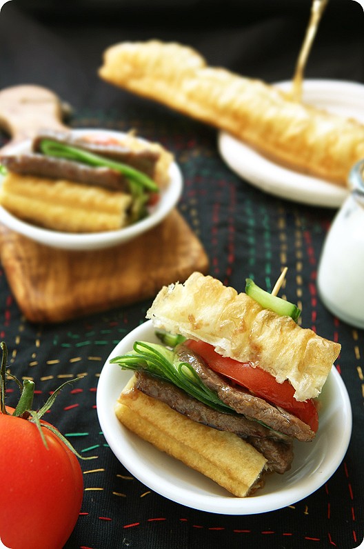 5、在油条上面摆上一层素牛肉片,铺上一层黄瓜,再摆上一层素牛肉,放上两片西红柿。
