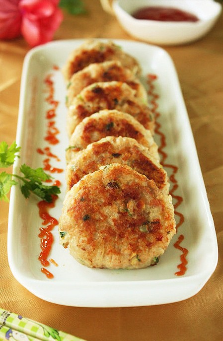 4.然后再取适量拌匀的莲藕素肉末,用手将其拍成小圆饼;
