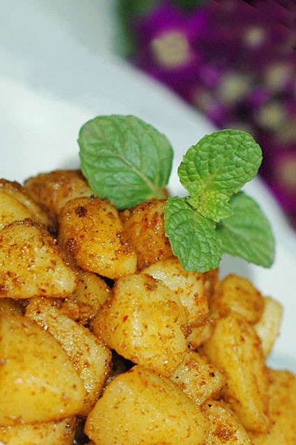 4、倒出多余的油,大火加热,煎至土豆块表面结一层薄壳,(那就是传说中的黄金甲了。。。)撒上盐,孜然粉,辣椒粉起锅。