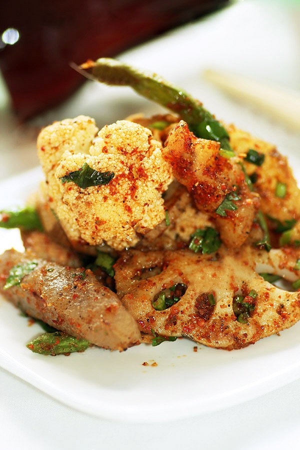材料:中型大小的土豆1粒莲藕1节平蘑菇1把魔芋(蒟篛)1块菜花1/4个香菜2根辣椒粉20克花椒粉10克孜然粉10克盐、味精少许