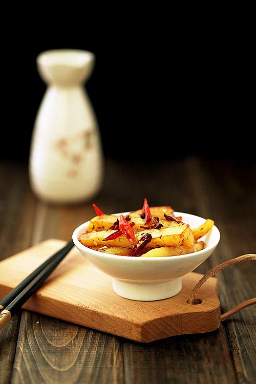 3 锅里留少许底油爆香,姜丝,花椒,干辣椒下入土豆炒匀用精盐调味,撒上