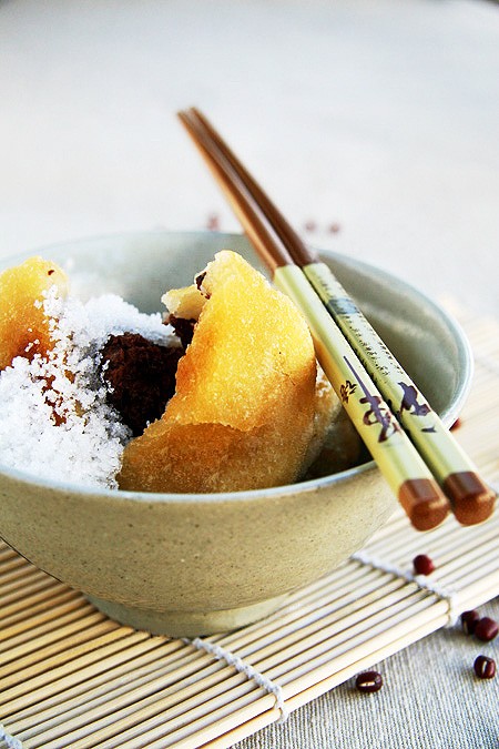 2、 用手揪一小块面团,压扁,用勺子盛入适量豆沙馅;