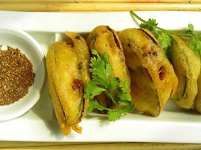 (3)将调匀的馅料夹在茄子片中,轻轻压实;