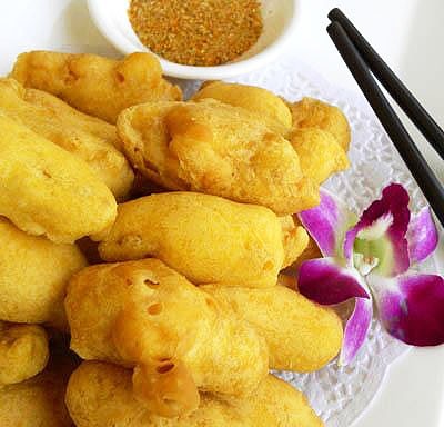 (4)把腌好的天贝粘上调好的糊,过油(油6-7成热)炸2-3分钟捞出,装盘,配椒盐即可。