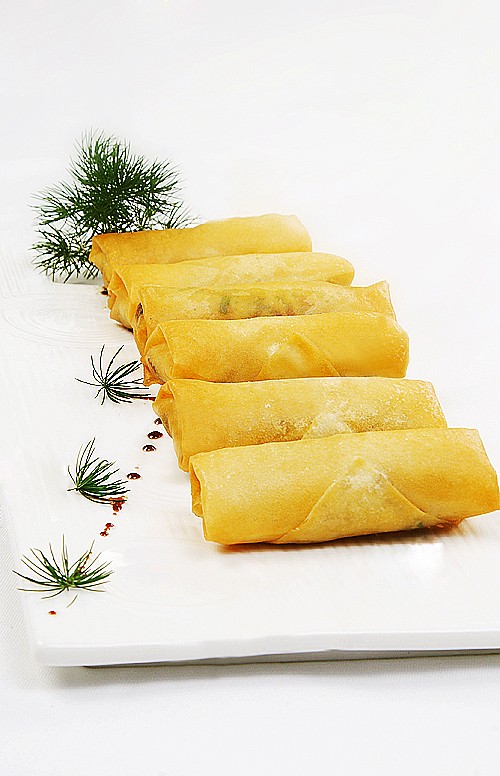 5.起锅,倒入精制油,烧至4~5成热时投入春卷,而油温控制在4~5成热炸成外皮酥脆,呈金黄色时即可。